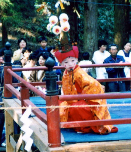 舞楽の8番目は稚児の1人舞。花の天冠を被って舞う。中央の舞楽では面を着けた大人の走舞であるが、平塩では稚児の舞になっている。