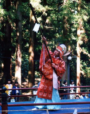 舞楽の1番目は大人の1人舞。中央の振鉾は三節といい、左方、右方、両方と2人で舞うが、山形では1人で、三節分を舞う。三節目は1人で2本の鉾を持つ。