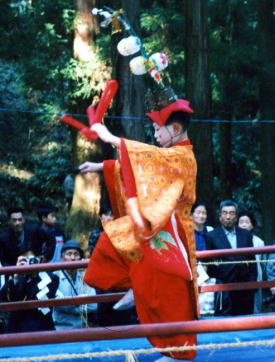 舞楽の7番目は稚児の1人舞。花の天冠を被り、蛇に見立てた赤い紐を持つ。