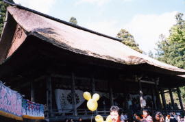 ここの舞楽の舞台は、石段(楽屋坂と言うそうです)を登った山門から、本堂に向かって組まれる仮設舞台です。そして、山門の二階が楽屋になっていて、そこにはしごを掛けて舞人が出入りするようになっています。。