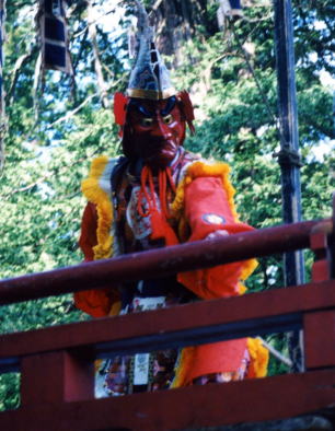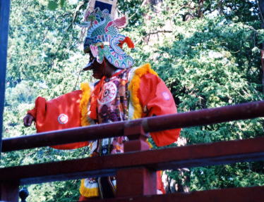 舞楽の2番目は、散手。艶やかな舞楽衣装に鳥甲に鼻面を着け、鉾を持つ。
