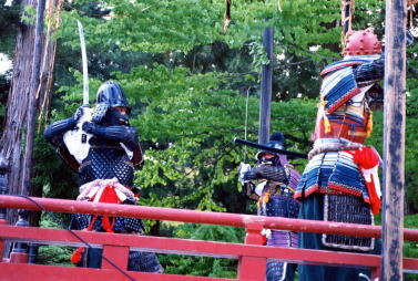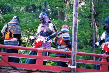 大陸伝来の太平楽も鄙舞楽の世界では、日本式の甲冑に太刀という出で立ち。