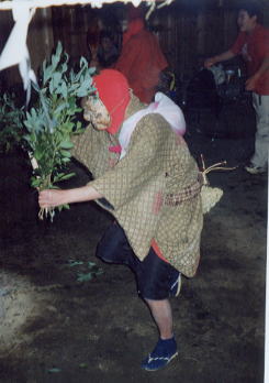 <婆>は道化の舞。榊を持ち、腰を低くして登場。