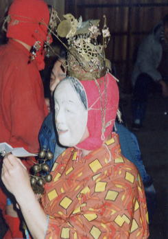 <みこ>は道化の舞。しゃくし、すりこぎ、婆等と一緒に出る。