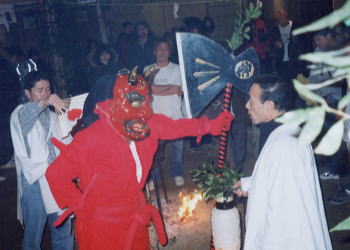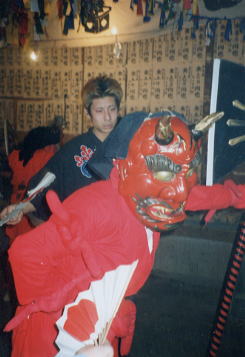 <榊鬼>は鬼の舞の2番目。五方を睨みながら登場。途中問答がある