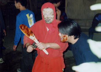 <すりこぎ>とともに登場。道化の舞で、しゃくしで味噌をつけて回る。
