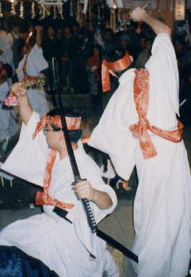 <たすきの舞>はたすきを掛け、刀と鈴を持った舞人が二人1組になり、4人で舞う。
