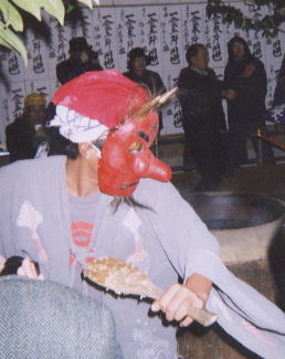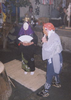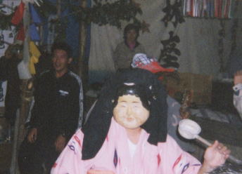 <みこの舞>は、しずしずとかまどを回るのみ。その前後に数々の道化面がにぎやかす。