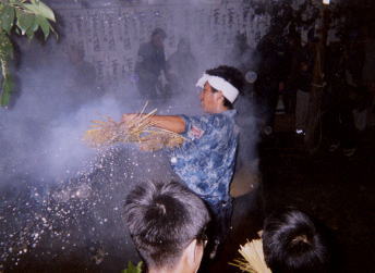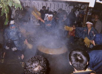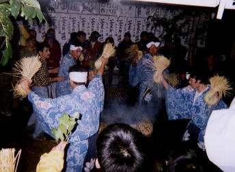 <湯ばやし>は、「湯たぶさ」を持ち4人で舞う。最後には湯を駆け回る。