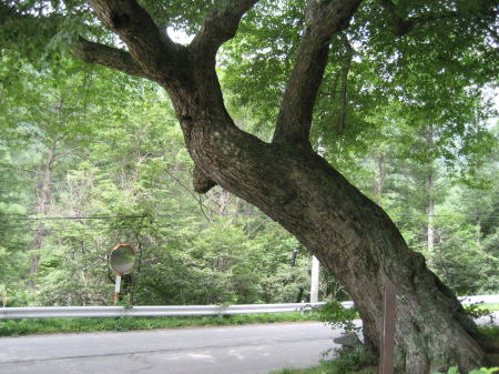 | 東御市新張(みはり)から群馬県吾妻郡嬬恋村の鹿沢温泉へ向かう地蔵峠は、湯道として知られ、新張から鹿沢まで100体の石仏の観音像が道標として造られました。その50番目、馬頭観音の脇に、このシナノキがあります。ここにはかつて茶屋があったといい、弘法大師が休憩したときに、持っていた杖を差したものが育って大木となったという伝説があり、「弘法大師のさかさ杖」とも呼ばれています。ちなみにシナノキは、長野県の旧称「信濃国」の語源だといいます。 |