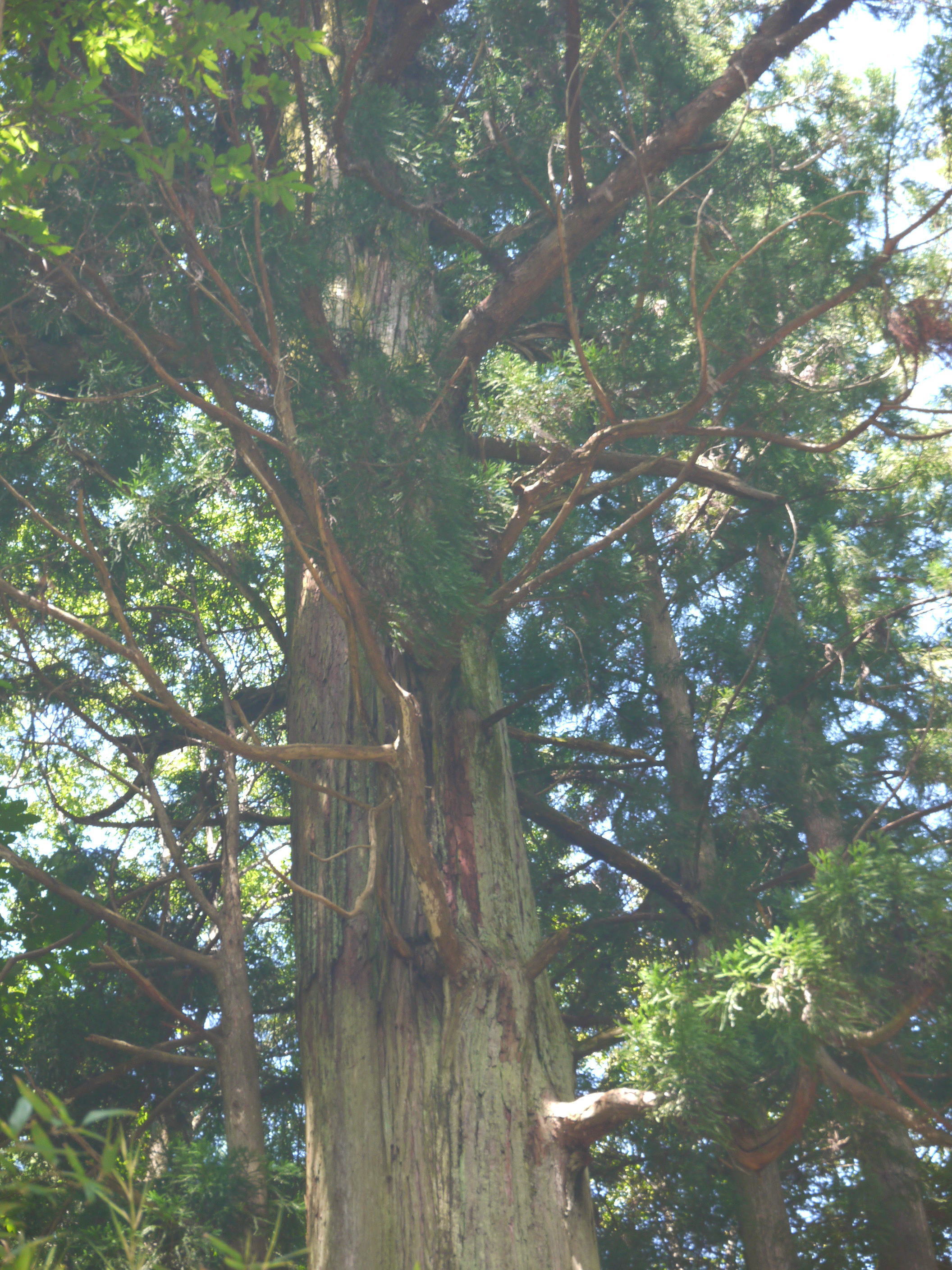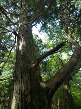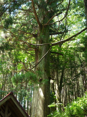 | 旧小坂町市街地から御岳山方面へ進み、道の駅「南飛騨小坂はなもも」、名勝「厳立峡」を目指して進むと、左手に神明神社があります。小さな神社ですが、巨木の森でもあります。拝殿裏の本殿の後方に大きく目立つ2本の杉が目に入ります。太い幹と、その上方に四方八方に枝が広がっています。何とも生命力を感じる大杉です。 |