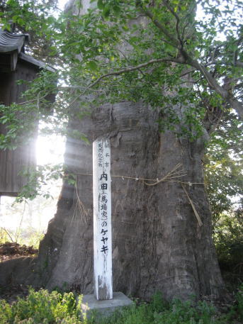 | 松本市も東部・東山山麓・内田にある馬場家住宅付近にある大ケヤキです。馬場家は、江戸時代末期の長野県西南部を代表する民家建築として知られ、当地方の民家建築・本棟造の主家をはじめとする建物群、庭や屋敷林がよく残されていて、国の重要文化財指定の住宅です。その馬場家の祝殿(同族神や屋敷神)である古屋敷大明神の後ろにあります(祝殿を欅の近くに祀ったのか?)。松本市内では最大のケヤキということです。 |