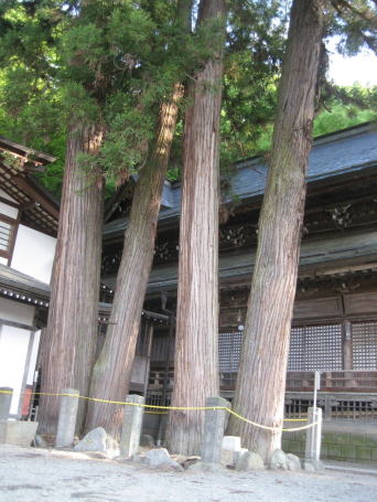上田市塩田平は信州の鎌倉と呼ばれる歴史の里。その西側に名湯・別所温泉があります。その温泉街の中心地に古刹・北向観音があり、その左側に2組のスギがあります。「めおと杉」と名付けられたこのスギは、それぞれ2本に分かれています。微妙に左右にV字型に伸びています。なお、同じ境内には、カツラの大木・