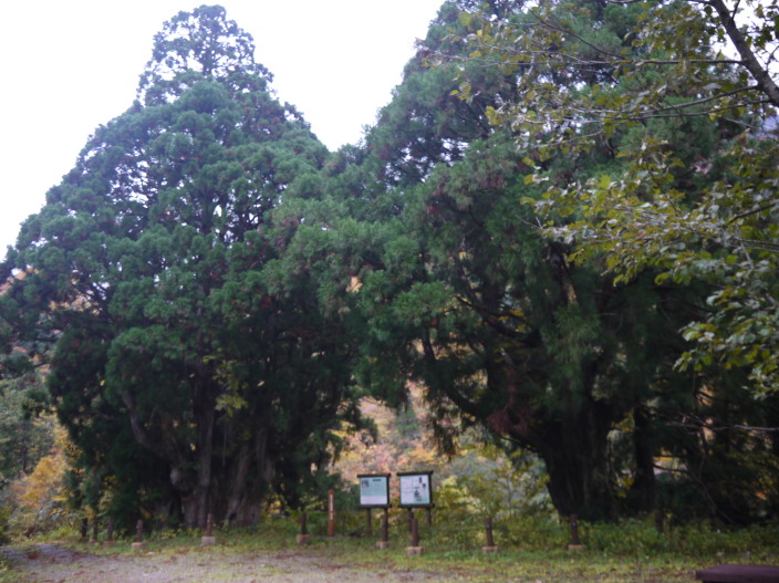 南又谷川にかかる「新土倉橋」を渡って、洞杉群の観察コースに向かう道は魚津市道。少し登ると、広場のようになった場所に2本の大きな洞杉が見えてきます。ここに洞杉の解説板や標識、案内図等があります。この場所から観察コースに入る道が整備されています。