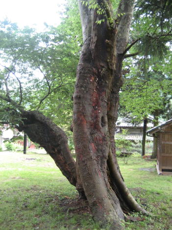 | 上田市真田町傍陽(そえひ)は長野市松代町へ抜ける地蔵峠に向かう街道沿いの地区。県道35号線沿いに赤い鳥居が見えてきます。ここが誉田足玉(ほんだたるたま)神社です。道路から見ると「巨木か!?」と思い、訪ねてみました。何とも奇妙な形のケヤキでした。4本の融合木なのでしょうか。それが縦に削られ、えぐられている感じ。かつては相当な巨木だったのでしょうが、マントのような樹皮に被われてるだけに見える幹には、ちゃんと葉が茂っています。生命力を感じさせます。 |