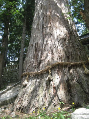 スキーで知られる白馬村。八方尾根の民宿街を行くと、鬱蒼とした細野諏訪社の社叢が目に入ります。拝殿に向かう石段の右側にかなり大きな御神木の大杉が空に向かってグンと伸びています。治承元(1,177)年に、八田弥五兵衛という人が献木したという伝承があるそうです。なおこの社叢には大木が多く、石段左側にもかなりの大杉があります。