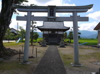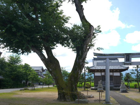JR越美北線(九頭竜線)が和泉村方面から下り、九頭竜川を渡り、真名川を渡る手前あたりの水田が広がる上麻生嶋地区にある八幡神社の境内にあるケヤキ。大きくVの字に広がる大きな2本の幹は、融合木でしょうか。しっかりと大地に根を張り込んでいるといった風格を感じさせます。内側の幹の枝がやや元気がなさそうに見えるのが気になりますが、気持ちのいいケヤキです。