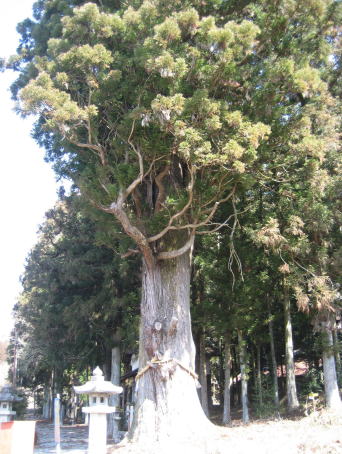 | 木曽郡大桑村須原は、かつて中山道須原宿で知られています。古刹・常勝寺や水舟と呼ばれる水場が残され、古い宿場町の面影を残しています。その須原宿から中央線を挟んだ東側の鹿島神社に、この大杉があります。鬱蒼と茂る社叢が遠くからも見えますが、近付いてみると、一際太い堂々とした杉が目に入ります。この鹿島神社は、7月17〜18日の例祭が有名で、宵祭りでは長持ち行列や《須原ばねそ》が踊られるそうです。そんな祭りの歴史も見つめてきた大杉です。 |