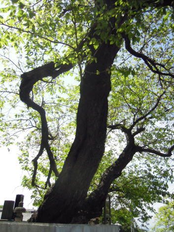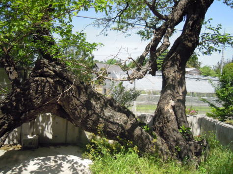 群馬県渋川市に合併した北橘地区は赤城南麓の地。上箱田の石田家墓地に自生するクワの大木です。養蚕の盛んな群馬県にあって、畑で栽培されることが多いのですが、これだけ大木になるのは珍しいのだそうです。3本に枝分かれしています。古木というより老木といった風格の大クワです。