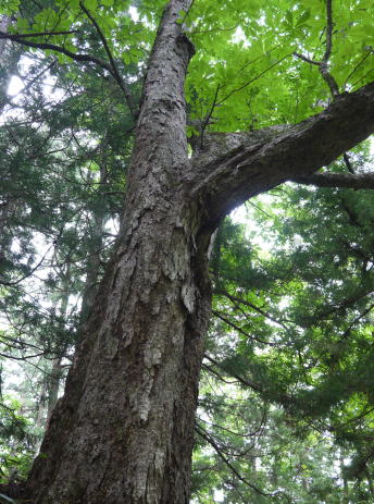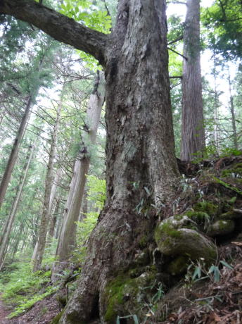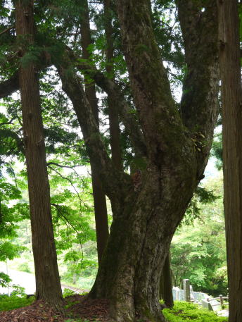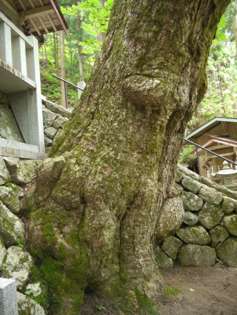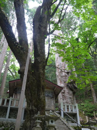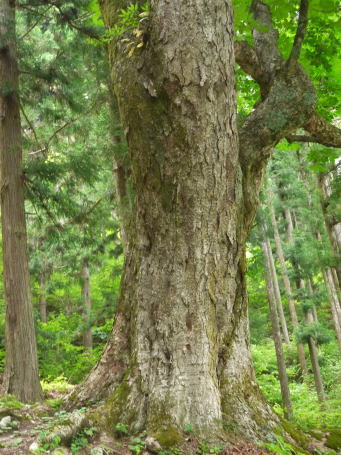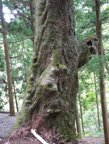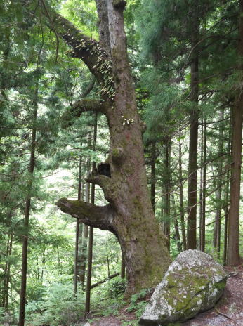| 阿智村園原は現在は中央道・恵那山トンネル付近ですが、かつて古代には、都と東国を結んだ「東山道」が通っていたところ。その神坂神社境内は歴史ロマンにあふれ、万葉集の防人の歌として知られる ちはやふる神の御坂に幣奉り 斎ふ命は母父が為 の歌碑が万葉仮名で記されています。境内には多くのトチノキの巨樹があります。特に目立つのが幹周 約4.7m、樹高 約20mのトチノキが、拝殿向かって左側の石垣から倒れ込むように立っています。どの木も樹齢は300年以上といわれています。パワースポット的雰囲気を醸し出しているトチノキ群です。 |