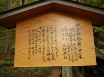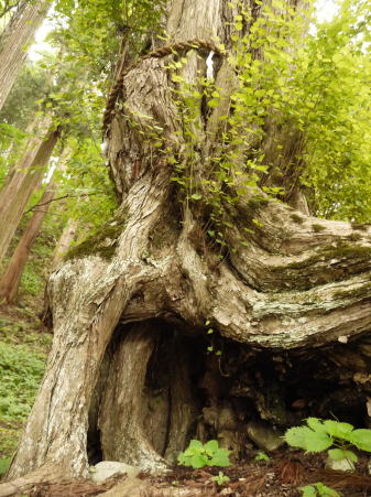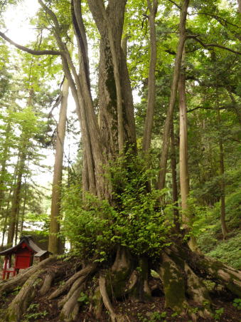 | 高山市一之宮町はかつての宮村で、飛騨国一宮として知られているのが、この水無(みなし)神社です。「延喜式」に記載されているということです。高山市街地から国道41号線を南下すると、こんもりとした社叢が見えてきますのですぐ分かります。このカツラは拝殿を向かって左手の奥にあります。安永年間に神社の裏山を切り開いたときに植え替えられ、その時の元木を神社の用材にしたそうです。神社の標木であったといいます。カツラ独特の幹立ち、根上がりの様子が、神秘的な感じを受けます。 |