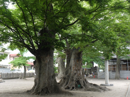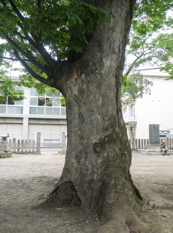 | 長野市三輪は旧北国街道に開けた古い町。その鎮守・美和神社は、式内社として古来から信仰の篤い神社です。長野電鉄長野線・本郷駅のすぐ近くで、住宅地とは思えないほど静かな雰囲気です。三輪鳥居という特徴的な三ツ鳥居をくぐると、広々とした境内に6m級のケヤキの古木があります。最も目を引くものは主幹を欠いていますが、堂々とした風格です。拝殿の脇には大きく傾いた1本も印象的です。近くには三輪小学校があり、子どもたちが境内で遊んでいる姿がありました。まさに鎮守の森といった雰囲気です。 |