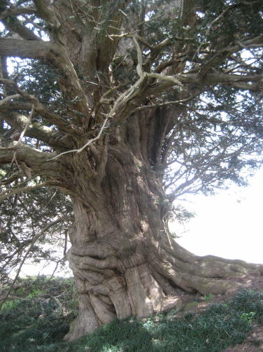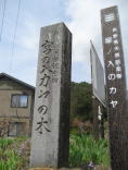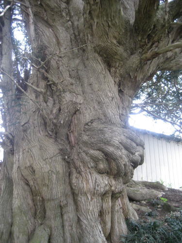 | 東御市祢津の廻り舞台で知られた西宮の祢津健事神社から更に山手に入ったところに、この大きなカヤの木があります。現在は畑の中ですが、かつての豪族・祢津氏の居館跡の場所だそうです。斜面にせり出すように生えていて、木の下の湿地帯には何と水芭蕉がありました。このうねるような幹の感じが大変神秘的な感じさえさせます。鈴なりになる実が弘法大師から賜った鈴だという伝説もあり、「カヤの木様」と呼ばれ、大切にされています。 |