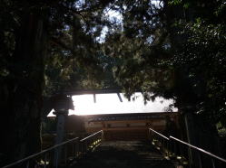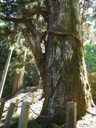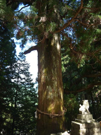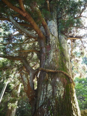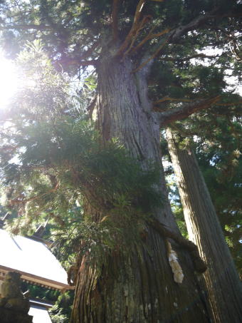 | 下呂市となった萩原町を通る国道41号線は、旧益田街道。平行して流れる飛騨川を渡り、右岸の山際に宮谷神明宮(神明神社)があります。その鳥居をくぐり、拝殿の手前の石段をはさむように2本の大杉が出迎えてくれます。夫婦杉と呼ばれ、拝殿向かって右側が雄杉、左側が雌杉です。雌杉の古い枝の痕を乳房に見立て、夫婦杉を崇めると母乳の出がよくなるという伝承があるといいます。縁結びの神としても知られる神社だそうです。 |