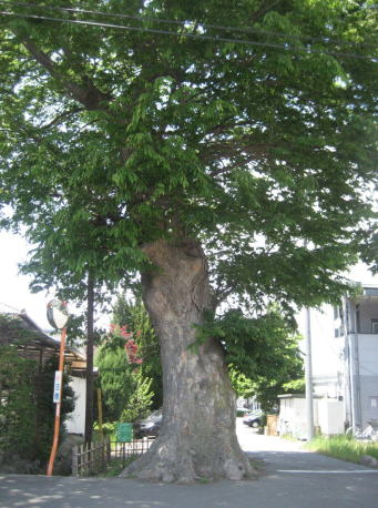 上田市の中部、千曲川左岸の中之条にある宮川神社前の道を進むと、道祖神が祀られる辻があります。そこに大きなケヤキがあります。宮川神社境内にもケヤキ等の古木が多いので、同じような時期の木でしょうか。道路脇に枝を大きく広げる様子はいい姿です。地域の人々に大切にされていることでしょう。