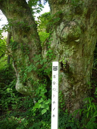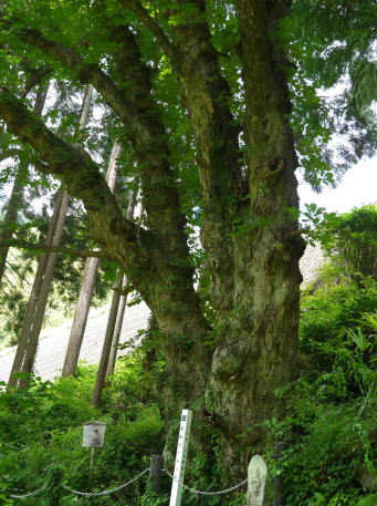 | 旧小坂町から御岳山方面へ進み、濁河川と椹谷の合流点にある絶壁の「厳立峡」を目指して進み、小黒川、濁河川、大洞川が合流するあたりが落合です。名湯「ひめしゃがの湯」の方へ進むあたりの川沿いの崖の下方に、大きなトチノキが見えてきます。大きな幹が2本に分かれ、それぞれが更に2つに分かれるので、4本に見えます。全体に幹がコブ状になっているのが印象的です。根元には石仏もあり、古くから信仰の対象になっていた古木でしょうか。 |