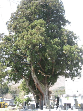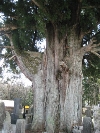 スキーで知られた白馬村は巨木の里!国道148号線を走っていたらスギの大木が目に入り、慌てて場所を探すと、何と墓地でした。墓を見守るように大杉が静かに立っていました。近くを通りかかったおばあちゃんにお声を掛けたら「この木は大きいね〜。樹齢何年かねえ?」と、こちらが訪ねたいことを聞かれてしまいました(笑)。
