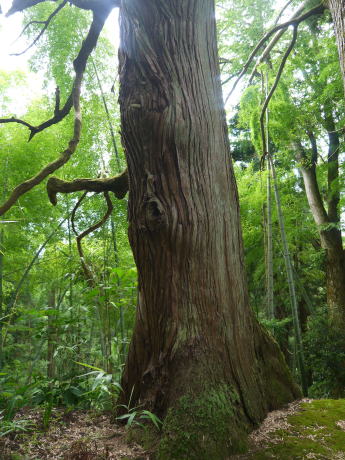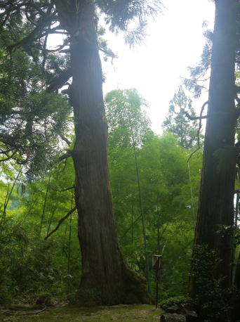 平泉寺は白山信仰の越前側の拠点で、泰澄大師が開山しました.。平泉寺町は、その宗教集落ともいえ、現在の白山神社を中心に遺構の発掘調査が進められているとのことです。白山神社向かって、お土産屋さん付近の駐車場から、右手方向、南側の女神川よりにある神明神社の境内に、このスギがあります。まっすぐに伸びたスギの姿から、かつて白山信仰にささえられた時代を偲ぶのもいいです。