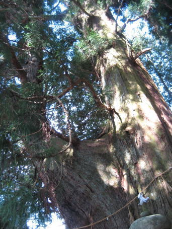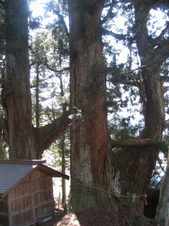 | 国道20号線を上松町方面から木曽郡大桑村へ向かうと、左側の山際に沿うように走る中央西線が見え隠れしてきます。バス停「上郷」から線路のガードをくぐると、斜面上の畑の奥の方に社叢が見えてきます。ここが神明神社で、近付くと異様な形をした、2本の大杉が目に入ります。2本ともかなりの太さを誇りますが、それぞれ二股に分かれ、自然のままに天に向かって伸びたといった杉の木です。双方とも注連縄が張られています。御神木として崇められている大切な木であることが偲ばれます。 |