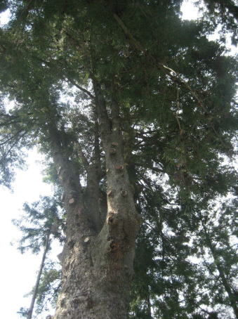 | 群馬県中之条町市街地から県道53号を沼田方面へ向かうと大道峠にさしかかりますが、その手前の「囀石(しゃべりいし)」の小渕家屋敷内に守り神のように立っているのがこの大きなモミです。火災のために空洞化した部分もありますが、とにかく大きく、元気のいいモミの大木でした。空洞内には「樅の木大神」と書かれた木塊が祀られています。また根本には祠があり、木には注連縄がかけられ、大切にされてきました。モミの木としては伊賀野のモミとともに、全国的にも最大級です。 |