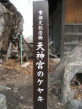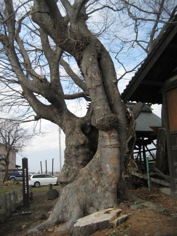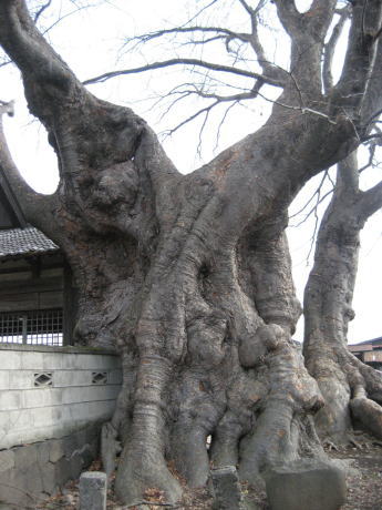 | 上田市岩下は、市内を流れる千曲川と神川が合流するあたりにある古い集落です。その中ほどに祀られる天神宮境内に、神社を覆い被さるように太い2株のケヤキがあります。東側はもともと3本立てであったのが2本が枯れ、空洞となっています。西側はまだまだ太く立派です。かつて落雷があったようで、空洞と焼け跡があります。長野県の巨木では第5位、ケヤキでは第2位だそうです。この木には雷が落ちてきて、村人が捕まえたところ「岩下には絶対に落ちない」と約束したので、天に帰したという伝説があるそうです。 |