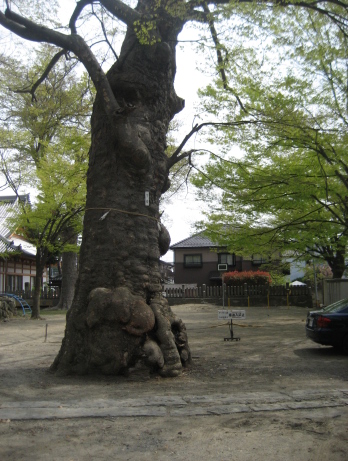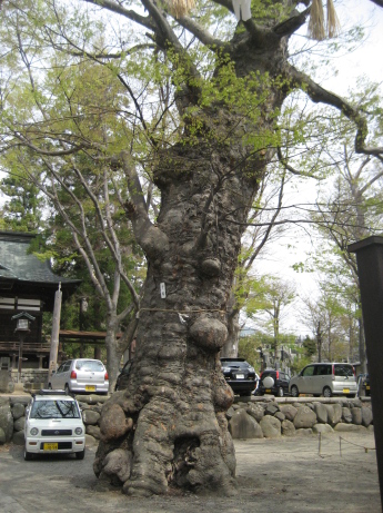 長野市妻科にある古社・妻科神社は、善光寺鎮座以前の水内(みのち)神として諏訪大社系の古い分社の1つで、湯福神社、武井神社とならんで善光寺三社鎮守とされています。その境内はケヤキの巨木が何本かあります。「千寿」という札のあるこのケヤキが、鳥居くぐってすぐ右側に目に入ります。ゴツゴツとしたこぶが印象的な、力強いケヤキです。