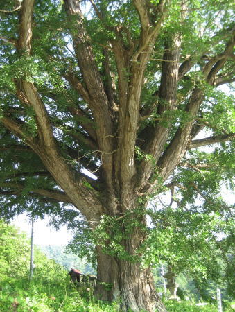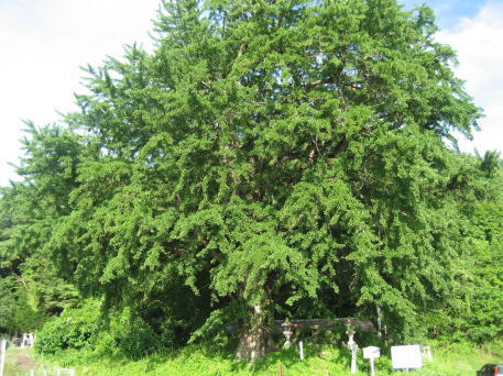 松本市に合併した旧・四賀村を通る国道143号線を上田市方面へ進むと、中川地区横川のカーブあたりに、この大イチョウがあります。枝振りがよく、とにかくよく目立ちます。解説板にもあるように、昔からこの地の道しるべだったのでは…と思います。