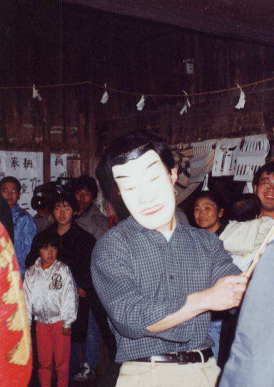面形の舞は37面もあるので、どんどんと登場。普段着でも面をつけ、鈴や扇を持つことで神様になる。