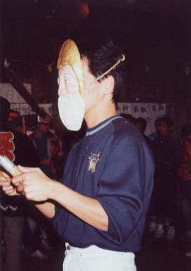 面形の舞は37面もあるので、どんどんと登場。普段着でも面をつけ、鈴や扇を持つことで神様になる。