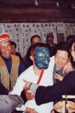 面形の舞の中でも激しく飛び跳ねるのが<四面>。写真は烏天狗のような面。