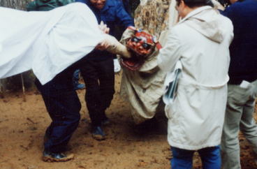 禰宜に祓われた獅子が、庭に出る。すると寝ている駒に問答する。そして出合いがしらに、獅子は駒の鼻づらを三度噛む。これは田楽ならではの豊作を祈る感染呪術。