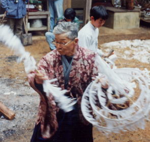 紙の飾りをつけたものを持って出て舞う。子どももともに舞う。かつてはささらや鼓などを持って、9人で舞ったらしい。