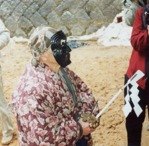 <おきな>の面を被って登場。問答の後、五方を舞って、火の回りを回る。