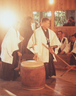 中央の太鼓に丸太で作った「芋」を出して、鍬で掘る所作をする。