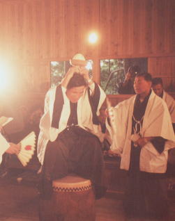 3合3勺の飯を盛り上げた椀(いなぼら)を頭上に捧げ、太鼓の上に乗る。