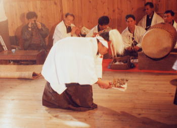 「駒」の面を着け腰を低く、手には鈴と扇を持って登場。途中、ばくろうと馬主が登場、アドリブのきいた楽しい問答を展開、見物人も盛り上がる。
