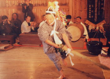 <つるぎ>の舞に対するもどきである。服装はつるぎと同じであるが、藁を束ねた木刀を差し、手にはシキミの小枝を持つ。