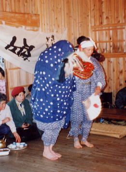 <しし>は扇を持った<まねき>(写真ではよく分からないが、頭の左側に面をつけている)とともに舞う。