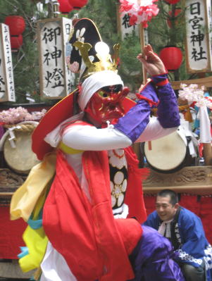 頭は大振りの赤色、カラフルな上衣をまとい、梅鉢紋の前掛けや烏帽子を被った天狗がダイナミックに舞います。