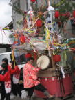 上田子は氷見市も南部、高岡に近いあたりの地区です。全体に赤を基調とした装束が印象的です。太鼓台も大きめで華やかな感じです。